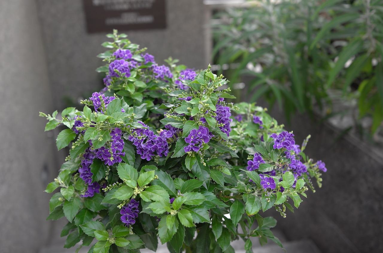 【Leica X】2025/07/14 アイルランド大使館前 デュランタ・タカラヅカ(宝塚) 紫色の花びらの白い縁取りが特徴です。タカラジェンヌが正装した袴姿に似ているから名付けられたそうです。ここのオーナーさんはとてもセンスの良い方だといつも思います。